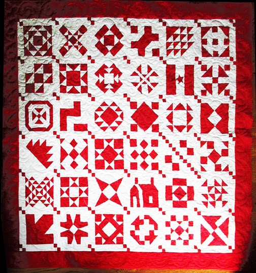Georgann and I are selling this red and white quilt to raise money for women's health issues. She made the red and white sample blocks for my Grandmother's Choice block-of-the-week blog. See the auction details below.