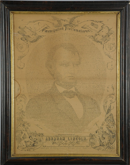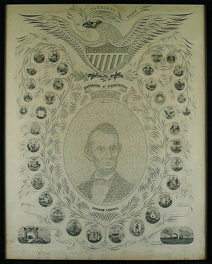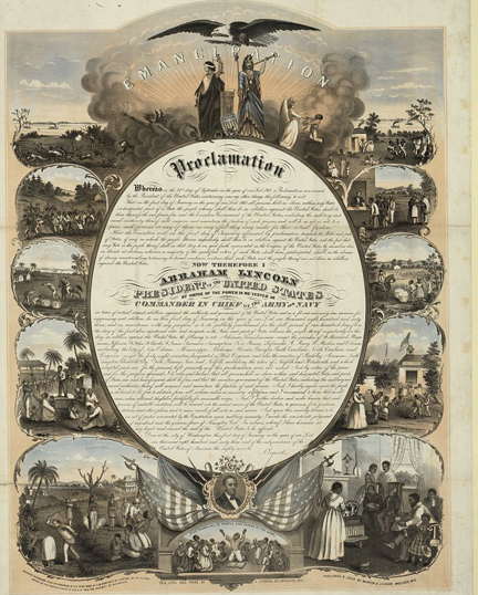 Click on the picture below and save it to a Word file or as a JPG. Print it out 8-1/2 x 11". It's a little fuzzy so you might want to print it smaller. The banner says "Emancipation Proclamations" (plural) because the print referred to both the September, 1862 and January, 1863 versions.