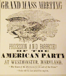 Joanne Manwaring of the Historical Society of Carroll Countyspeculated that this quilt might have been inspired by the Know-Nothing Party, formally known as the American Party. She noted the Know-Nothings were popular in Carroll County in the 1850s and pointed out their use of an eagle symbol in their advertising.