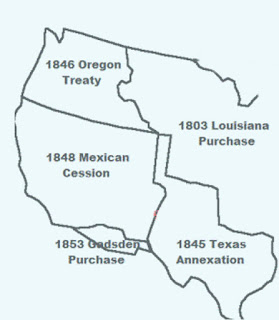 During that decade the United States was at relative peace with the rest of the world. The war to annex Mexican territories was over by 1848. California became a state in 1850 and further southwestern territory was peacefully purchased in 1853. Any of our continuing scuffles with England were temporarily over with Canadian boundary settlements for the Oregon Territory.