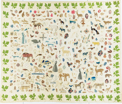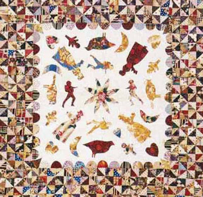 Florence Peto, the collector who found this quilt, was sure it was an American Civil War souvenir, but I find that hard to believe. It looks English to me in style and is more likely to be commemorating the English Crimean War of the 1850s.
